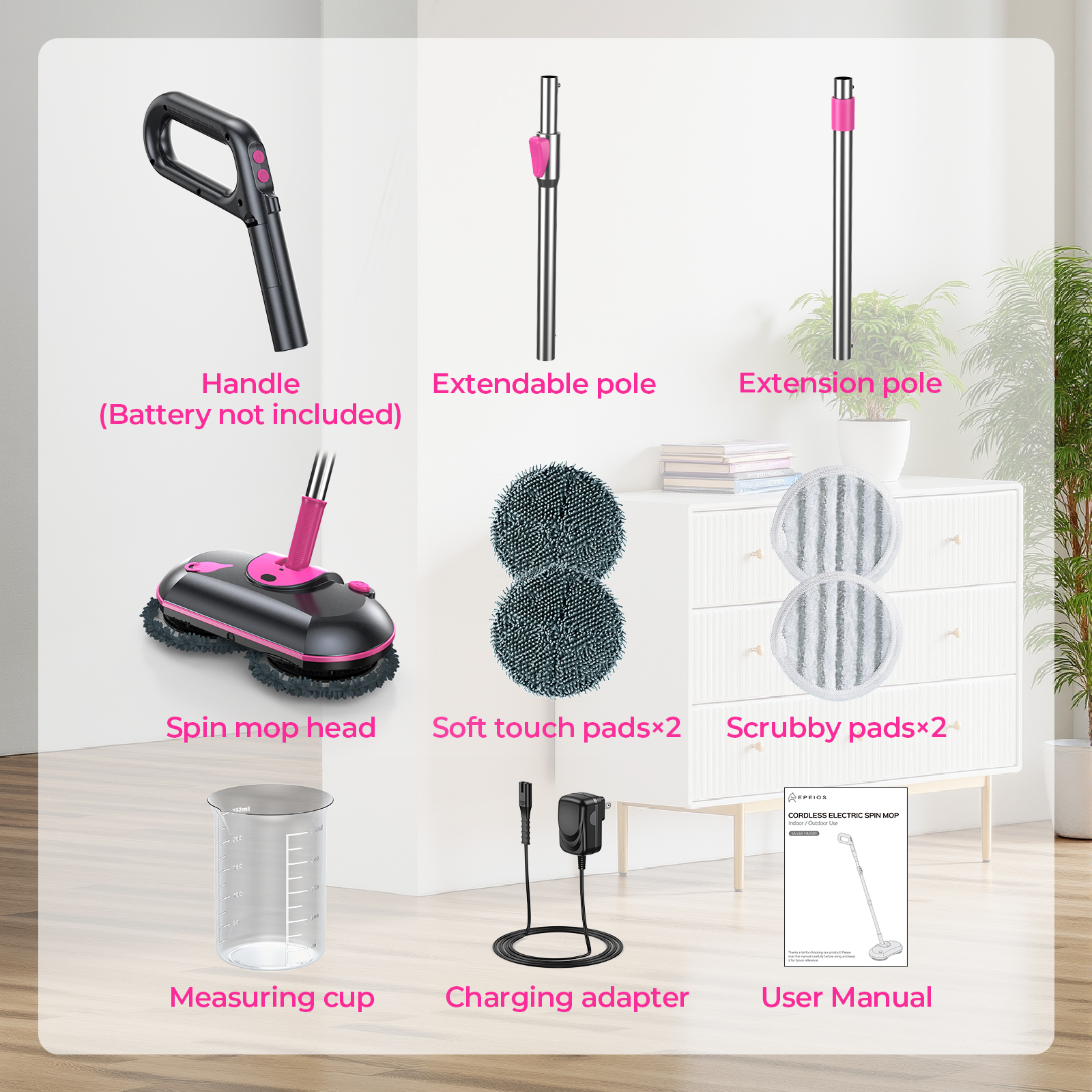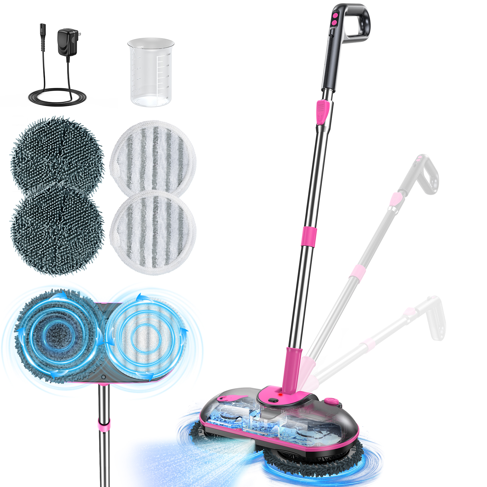 What will you get: Soft Touch Pad ×2, Scrubby Pad ×2, Measuring Cup ×1, Charging Adapter ×1, Spin Mop Head ×1, Extendable Pole ×1, Extension Pole ×1, Handle ×1 (Requires 2×AAA batteries, not included), User Manual ×1